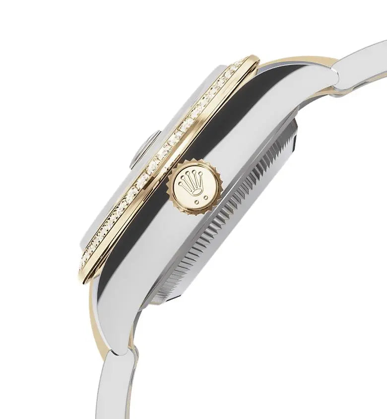 Ez a lenyűgöző modell a Rolex időtlen eleganciáját testesíti meg. A Yellow Rolesor (18 karátos sárga arany és Oystersteel acél kombinációja) garantálja az exkluzivitást és a tartósságot, miközben a gyémántokkal kirakott lünetta és a finom champagne-számlap minden részletében luxust sugároz.